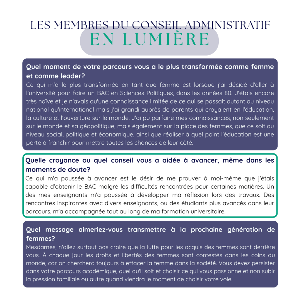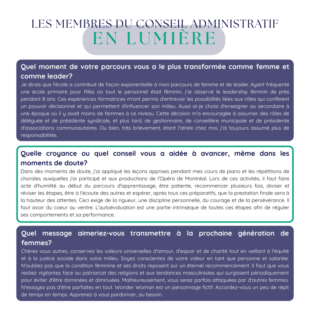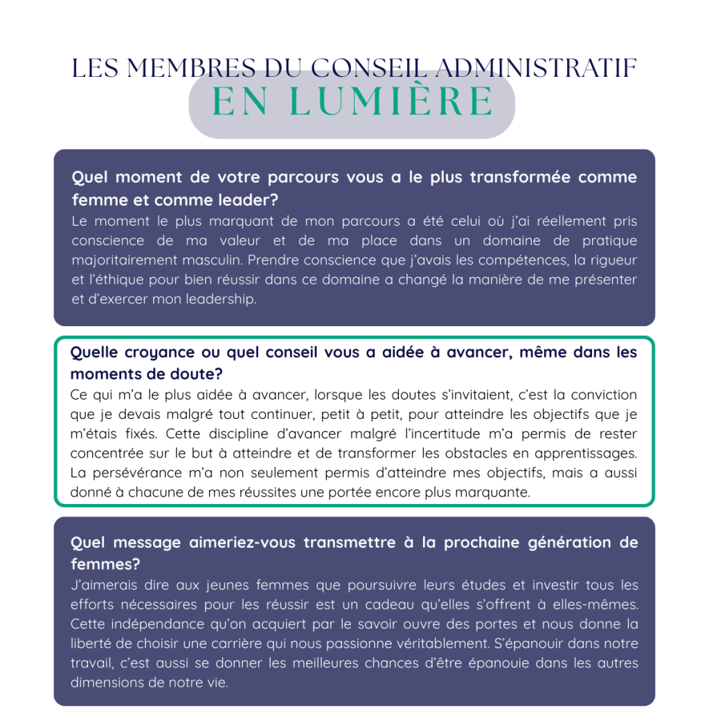 Nous souhaitons partager une série de portraits mettant en lumière les femmes qui composent notre conseil d’administration – leurs réflexions, leurs inspirations et les valeurs qui les animent.