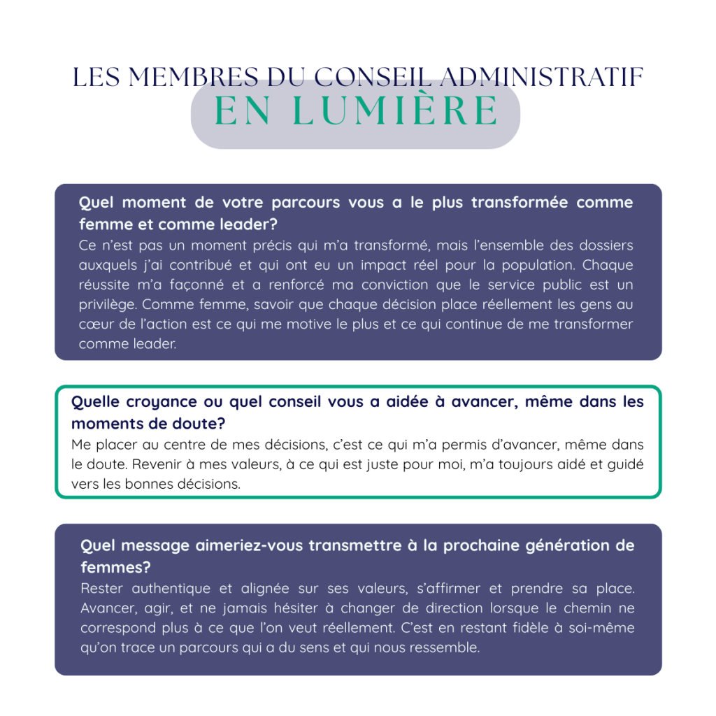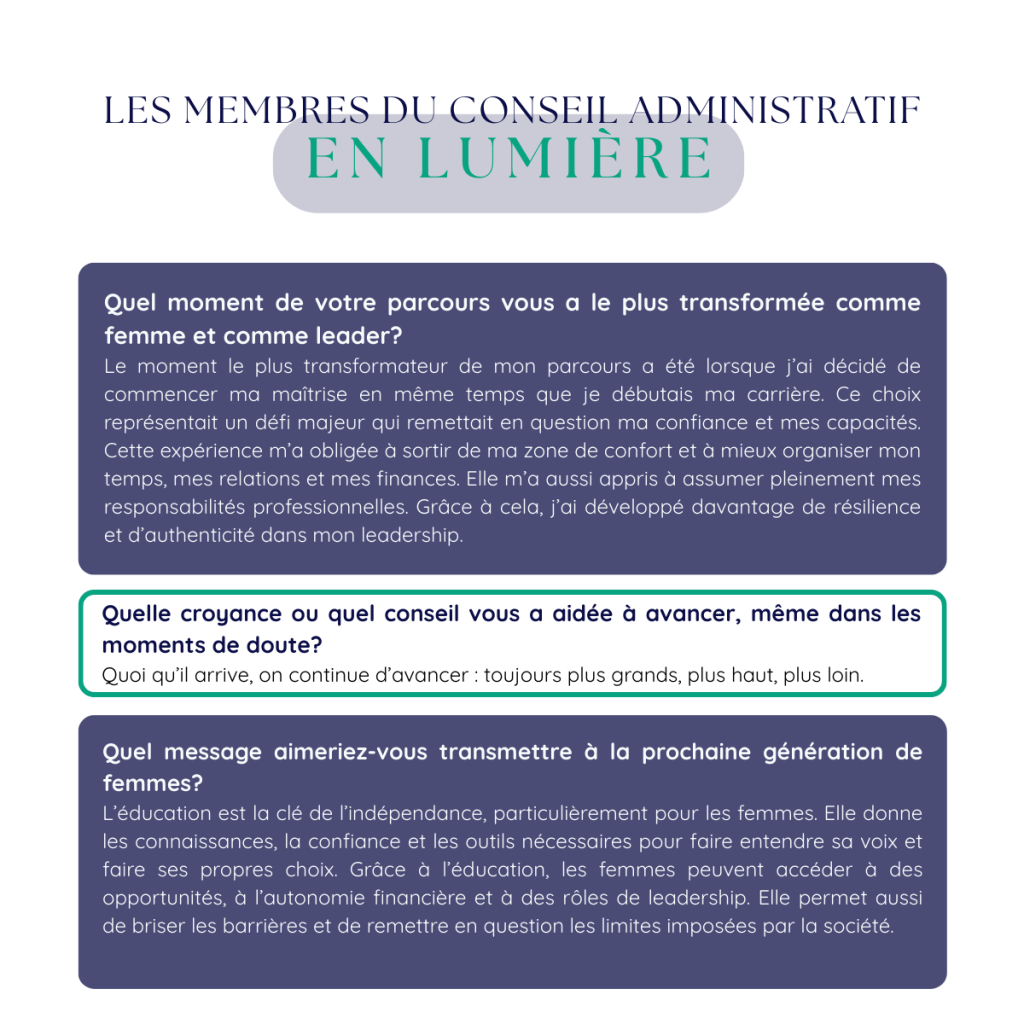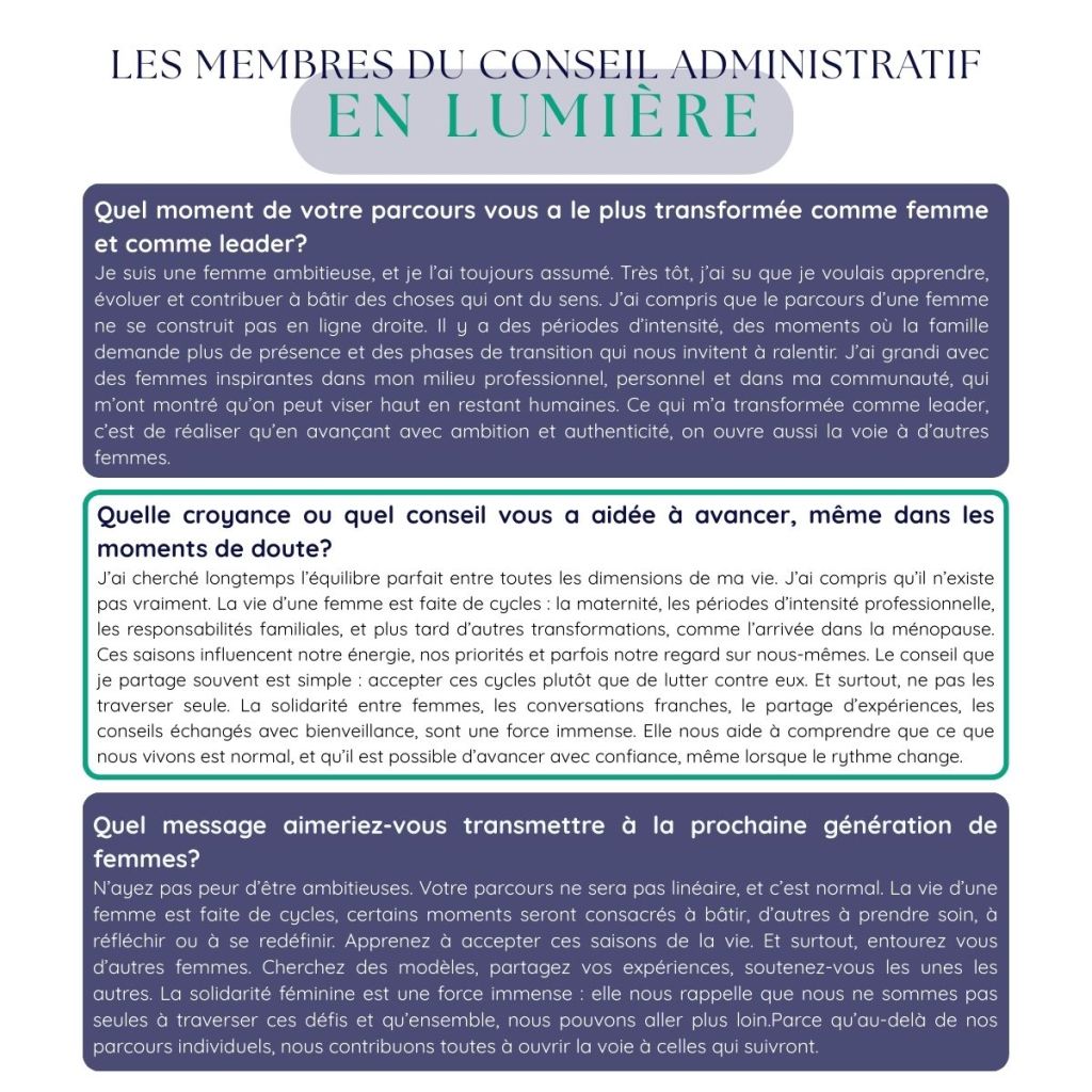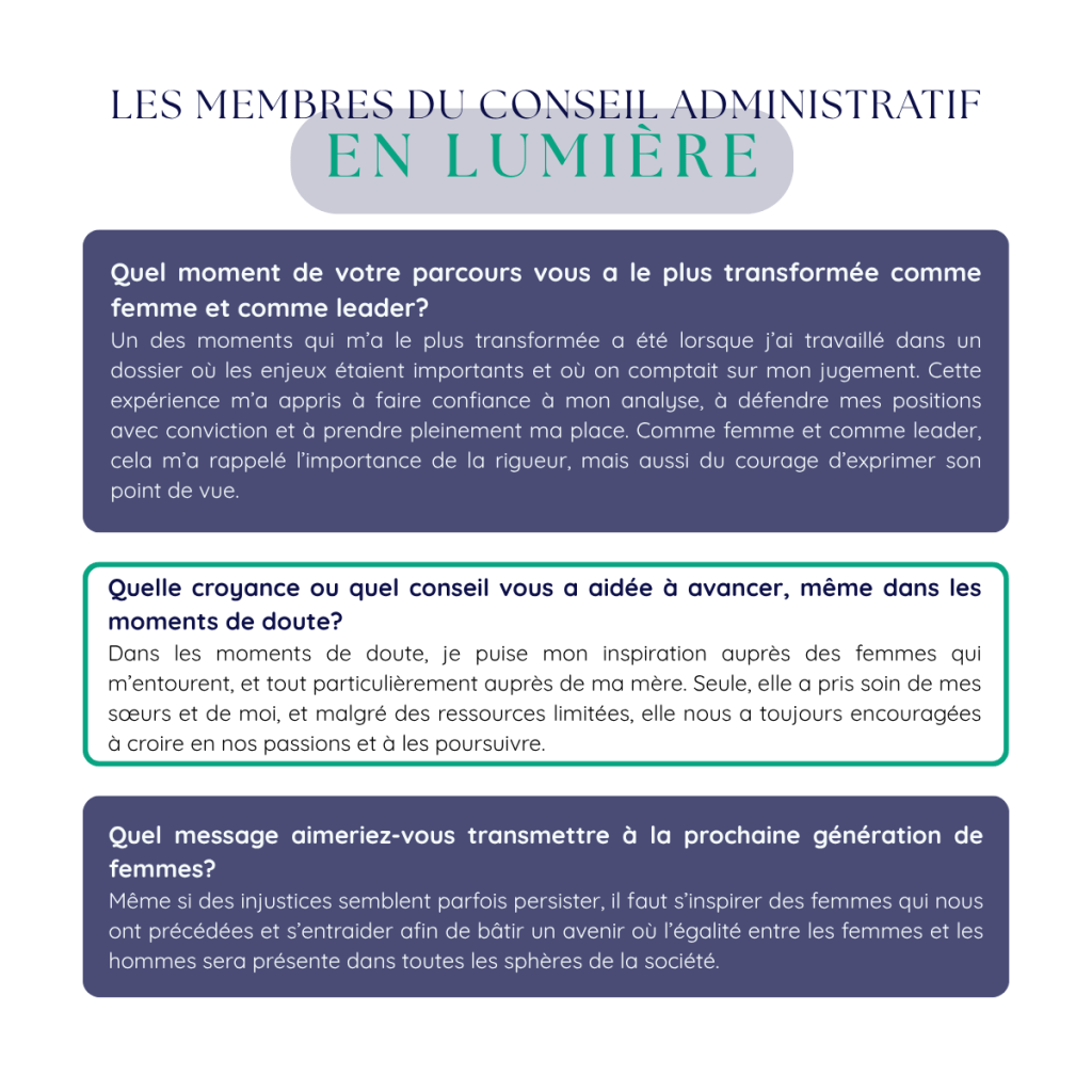 Nous souhaitons partager une série de portraits mettant en lumière les femmes qui composent notre conseil d’administration – leurs réflexions, leurs inspirations et les valeurs qui les animent.